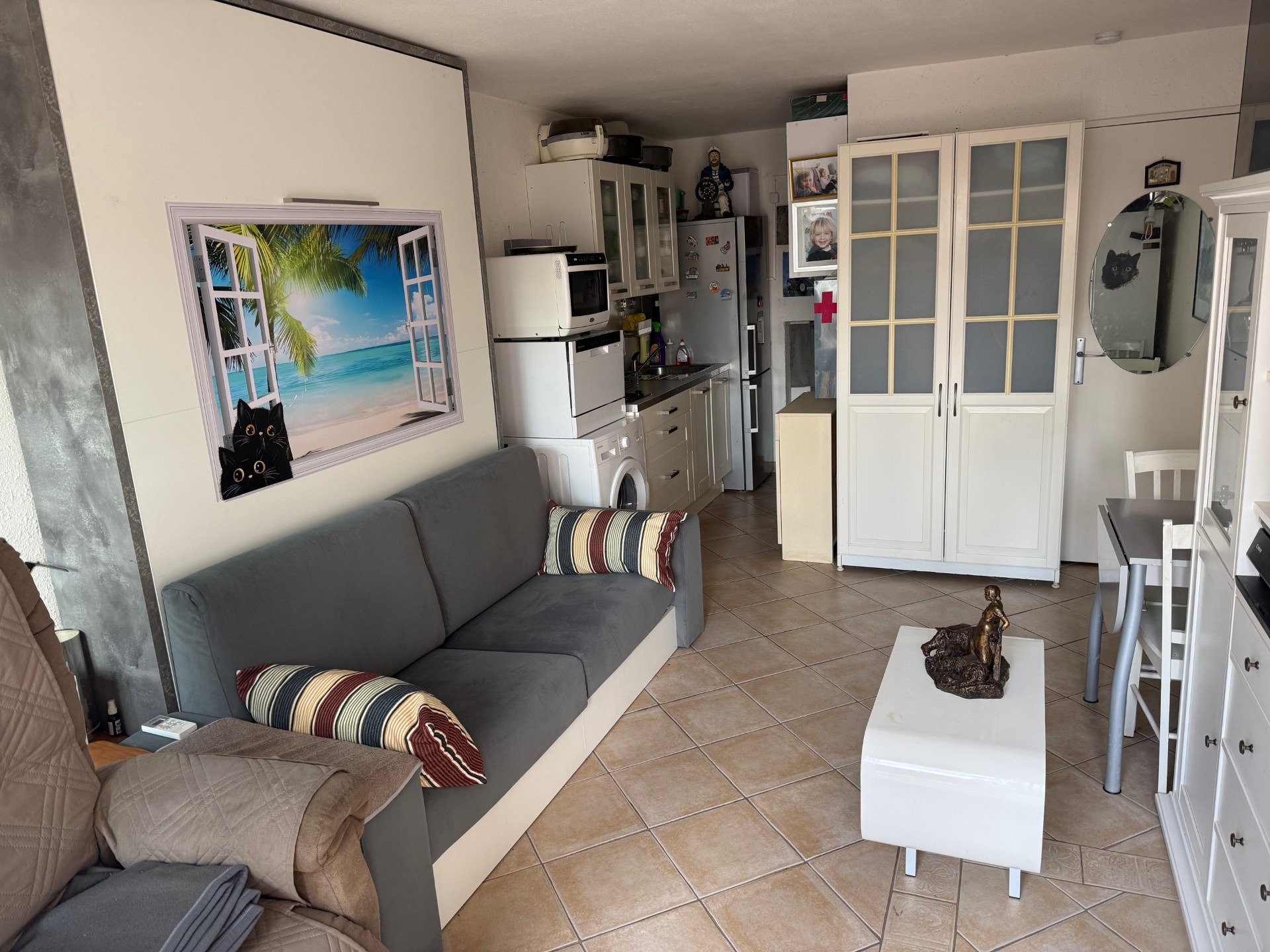 Au GRAU DU ROI. Secteur Palais de la Mer. A proximité de la plage et des commerces. Au rez-de-chaussée d'une résidence sécurisée. Appartement de type studio d'une surface de 21.42m² ouvert sur une terrasse de 12.5 m². Ce studio climatisé est composé d'un séjour avec coin cuisine, d'une salle d'eau et d'un wc séparé. Il est vendu meublé et très bien équipé, notamment d'un lit escamotable qui très facilement transforme l'espace salon en espace nuit.