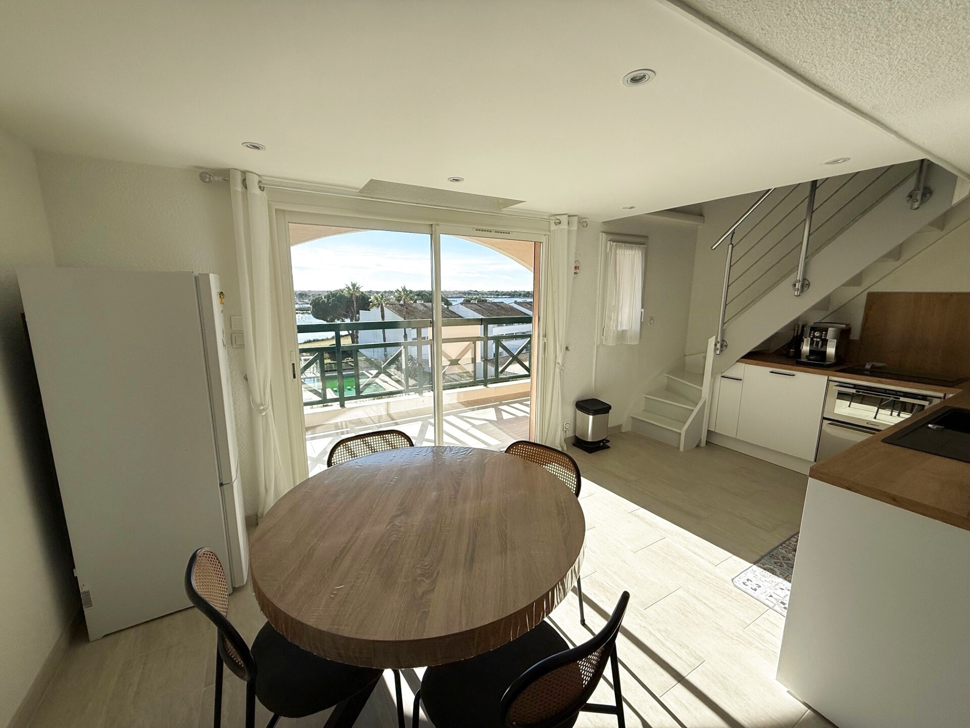 Appartement composée d'une entrée, d'un séjour spacieux et lumineux avec coin cuisine équipée ouvert sur une terrasse exposée S/E de 9 m² offrant une vue magnifique sur le lac salonique, d'une salle d'eau, d'un wc séparé et en R+1, de 2 Chambres avec dressing et d'un palier pouvant faire office de lieu de couchage ou de bureau ou tout simplement de rangements.